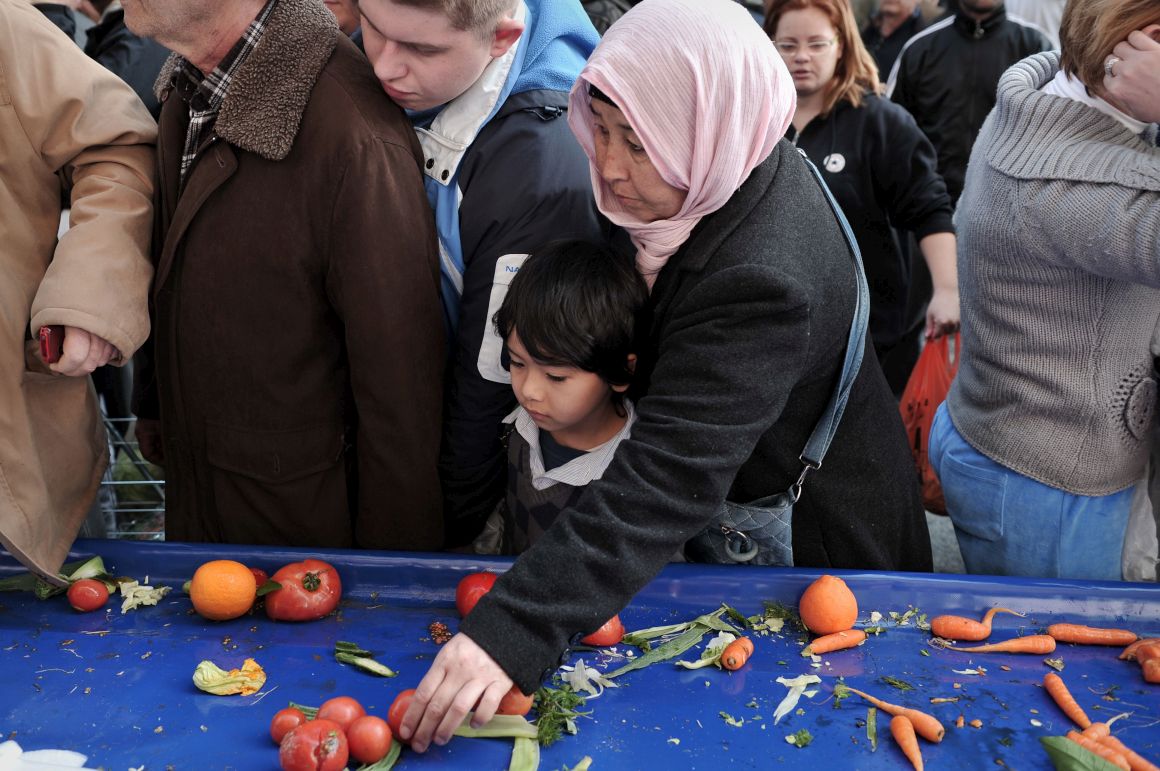 Centenas de pessoas amontoadas esperando receber um saco de legumes das mãos de agricultores mostram o grau de necessidade dos gregos.