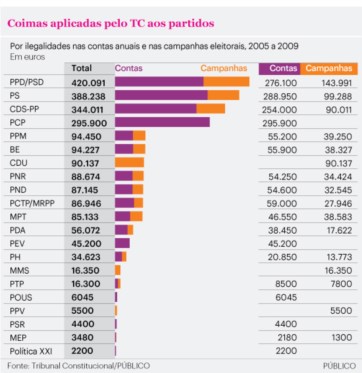 Entretanto, pelo mais recente acórdão do Tribunal Constitucional sobre as contas partidárias, ficámos a saber que as multas a pagar pelos partidos devido a irregularidades nas contas e nas campanhas eleitorais rondam os 2.260.000 de euros no período entre 2005 e 2009.